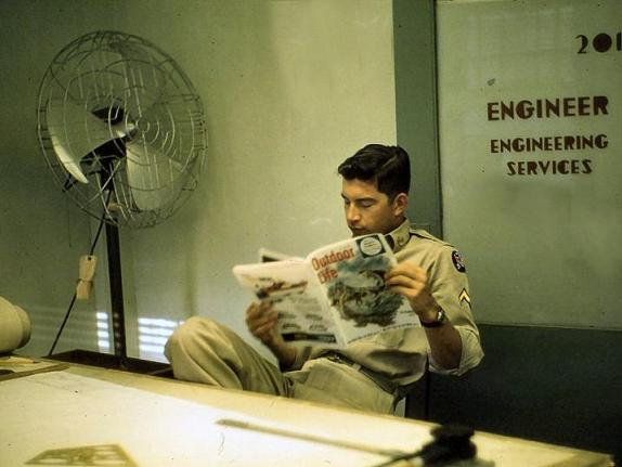 When the 14th left for Okinawa, I was re-assigned the HQ of the 25th division at Schofield Barracks. I worked there in G3 mainly preparing the maps for field exercises, and in the field I maintaining the situation maps as the exercise progressed. It was there that I discovered the Hawaiian mosquito! Even though I was only with the 25th ID for 2 months I am still proud to have been a part of one of our finest army divisions. After leaving active duty I completed my 4 years of reserve and was discharged an SP4. I often wish I would have stayed in the reserve but as it was, that would have been a sure hitch to Viet Nam.