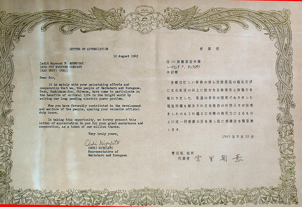I promise to exchange some experiences from that time with you soon. I have attached one of the items (Certificate of Appreciation) I dug out of my foot locker. It was the result of one of the projects that we undertook to help the villages near our compound.