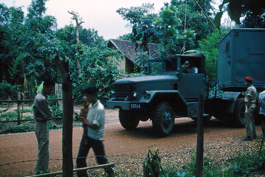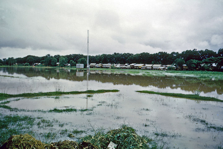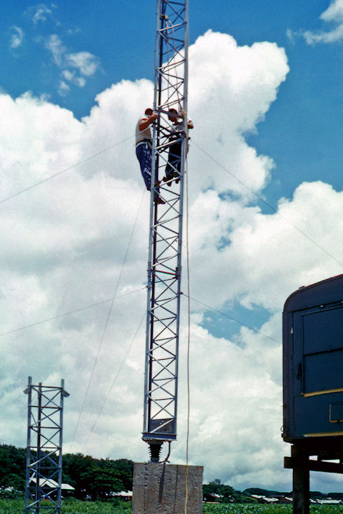Vientiane Laos, summer 1959, preparing the permanent AM transmission site. We erected the antenna in the middle of a large rice paddy, where we could lay out the ground radials in a relatively flat area, and provide maximum ground plane due to the water. We had to dam up the water to dig a foundation, and pour concrete for the antenna base. Wading and working in the water was difficult, and when we left the paddy we had to find and remove leaches that had attached to our legs. The antenna consisted of twelve, 10 foot sections bolted together. After we got about three 10 foot sections up (2nd being installed here), most of us had difficulty with the height. We resorted to hiring locals—well liquored up, to get the tower completed. When we finally became operational, it was gratifying to know that Air America pilots coming into Vientiane airport, were using our signal to home in on.....Gary Gloyd |