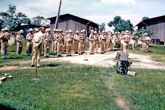 Near Vientiane, Laos, summer 1959. Lao Army band rehearsing for a recording. The studios were quipped with portable equipment. This recording was to be broadcast on Lao National Radio. |