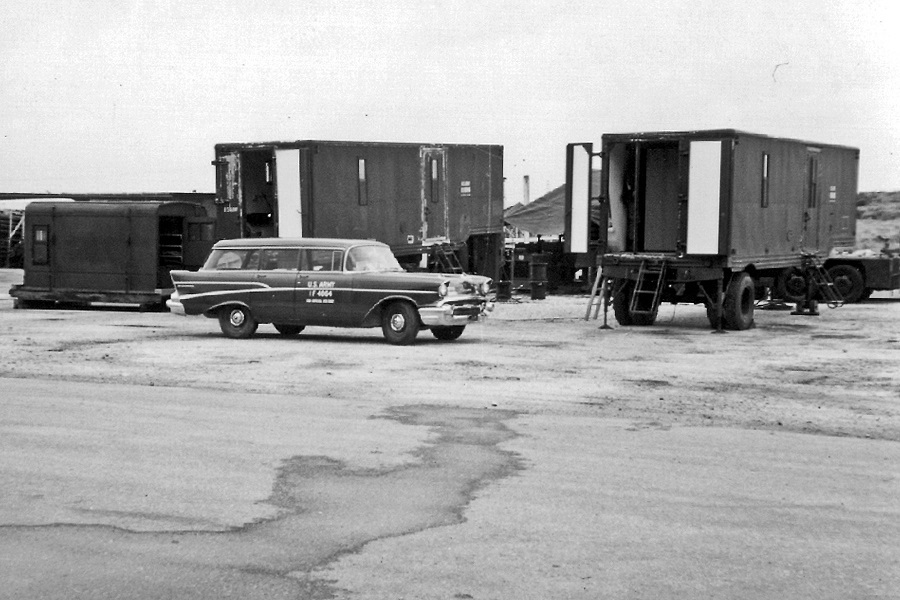 Gates AN/MRT-5 equipment Being Readied For Deployment To Laos In 1958 From left: Antenna tuning hut, Studio Van and Transmitter Van with 1957 Chevy in Foreground. |