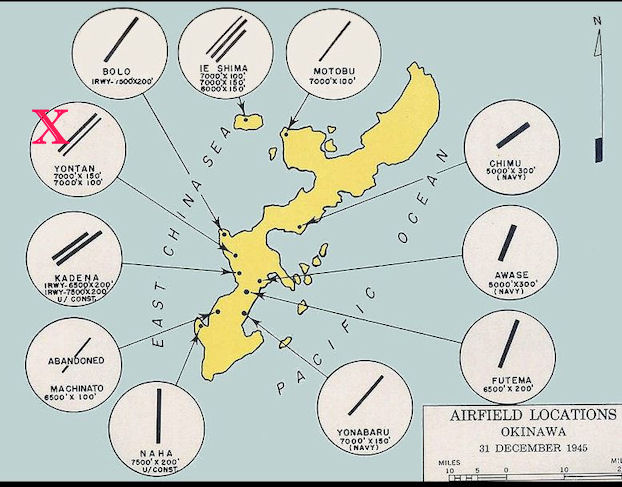 Location of Yontan Air Field at Red X. Note that Kadena is Below or South of This Location |