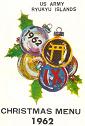 Life at Headquarters Company was typical of Asian duty of the time.. We paid $7 a month to have an Okinawan house boy clean our shoes and brass and another Okinawan to take our KP duties.. This sounds incredible today but the base pay of a Pvt in 1961 was only about $80 a month. .The food in our mess was actually quite good and fortunately I saved a few holiday menus. Most of the officers brought their families to these holiday meals which added to the holiday spirit and made us briefly forget we were thousands of miles from home. Click on Image to enlarge and see content.
