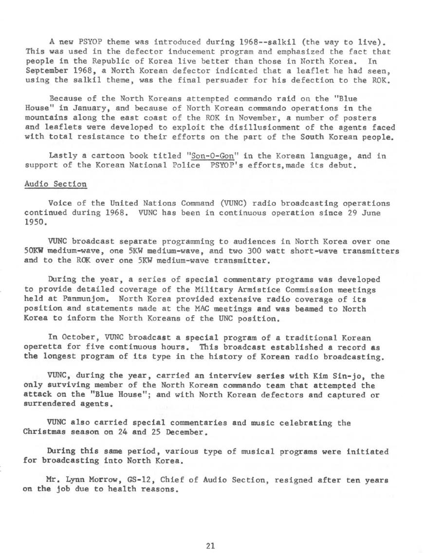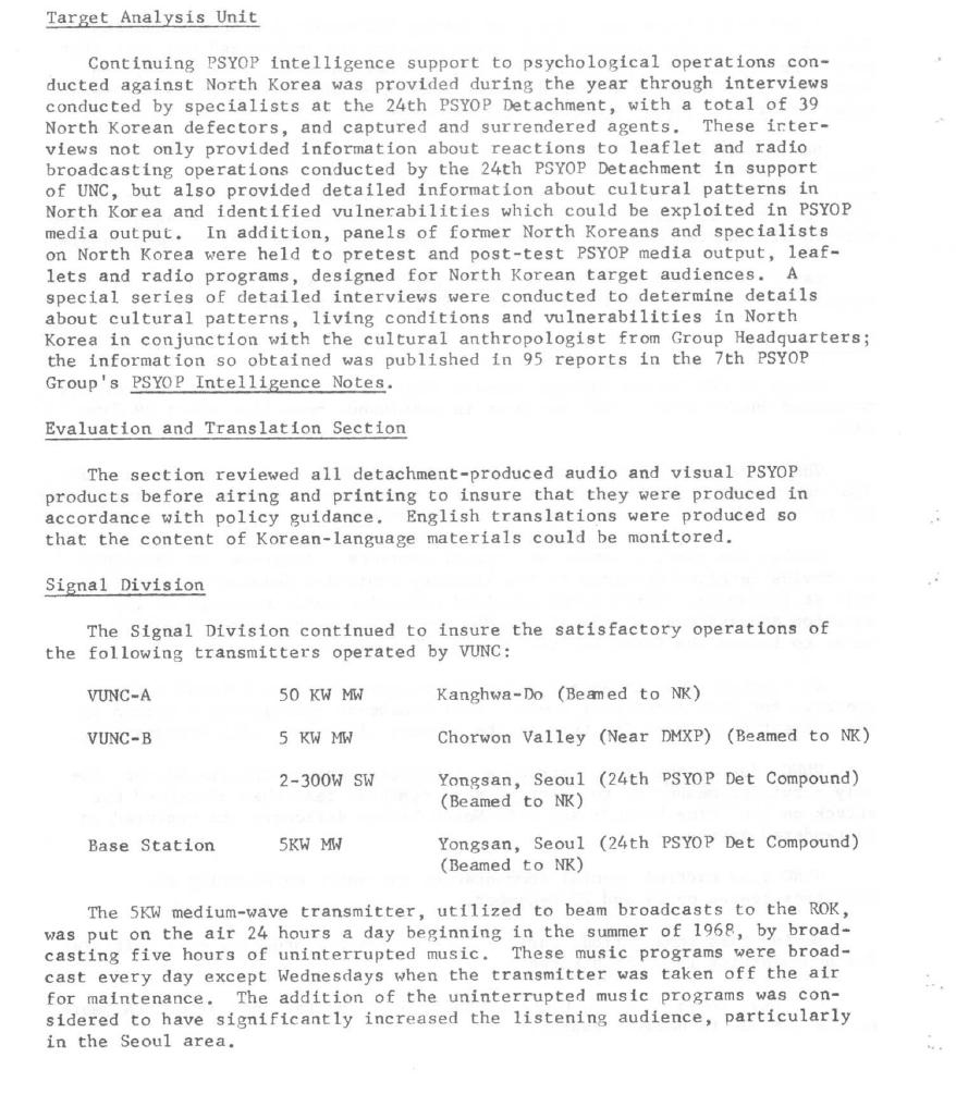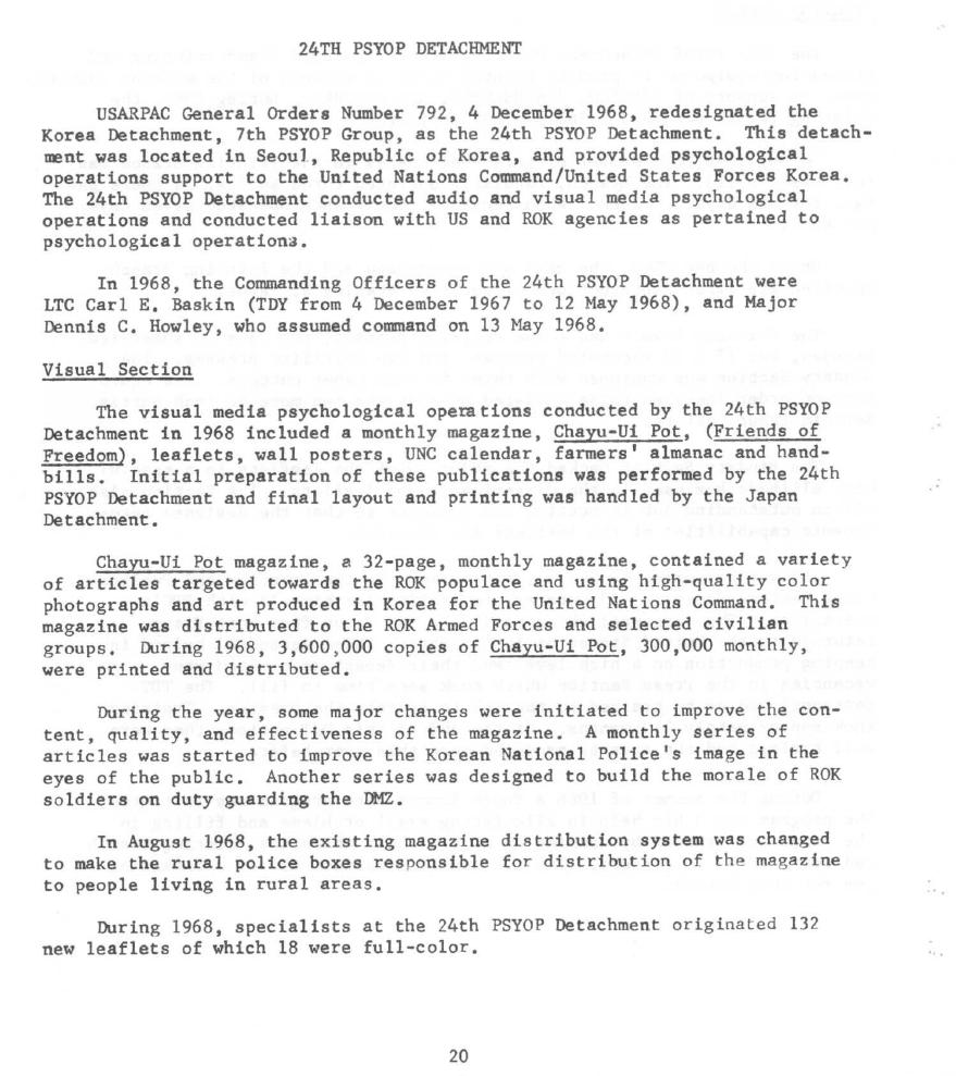 The 7th Group 68 Unit History indicates that the 24th PsyOp designation was evidently "reused" in 1968 to include the Korea detachment. 7th Group members serving in Korea were now officially part of the 24th PsyOp Detachment. The first Commanding Officer was LTC Carl E. Baskin followed by Major Dennis C. Howley.