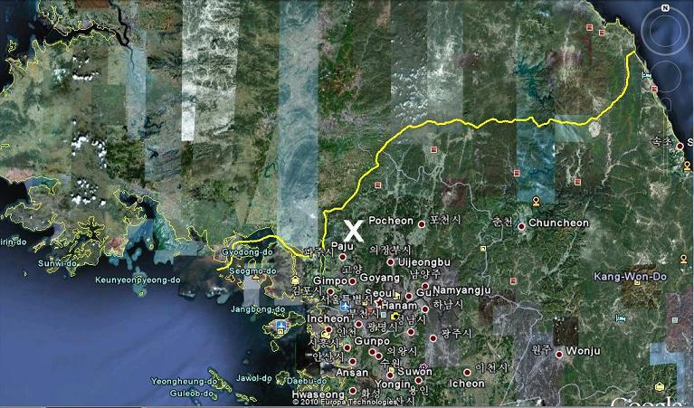 The first image from Google Earth is a macro view of the region. The white "X" marks the location of the VUNC B site. The yellow line is the DMZ.