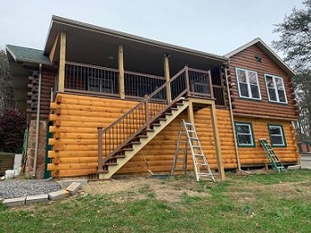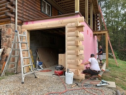 The next two pictures show construction of garage using frame lumber and log siding. Special log end pieces were used to match design of logs in home.
