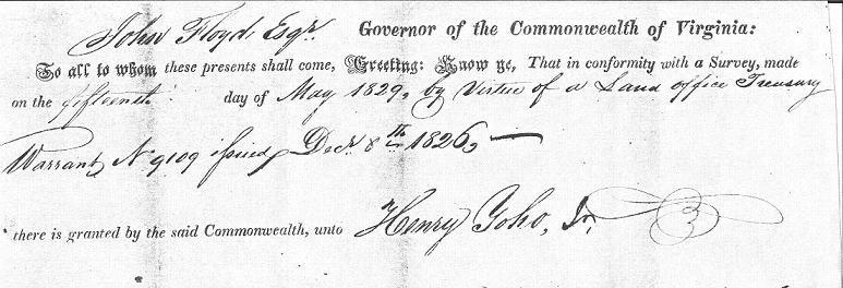John Floyd Esqr. Governor of the Commonwealth of Virginia: To all to whom these presents shall come, Greetings: Know Ye, That in conformity with a Survey, made on the fifteenth day of May 1829, by virture of a Land Office Treasury Warranty A 9109 ? Dec 8th 1826, There is granted by the said Commonwealth, unto Henry Yoho Sr. a certain Tract or Parcel of Land containing Two Hundred Acres, situated in Tyler County, on the water of Proctor run and bounded as follows to Wit:Beginning at a large poplar on the North side of the hill, from thence at 18 degrees E. 230 poles to a large oak, thence 60 degrees ? poles to a beech and walnut, thence S 18 degrees 230 poles to a white oak on a pond, thence N 60 degrees 140 poles to the beginning.
