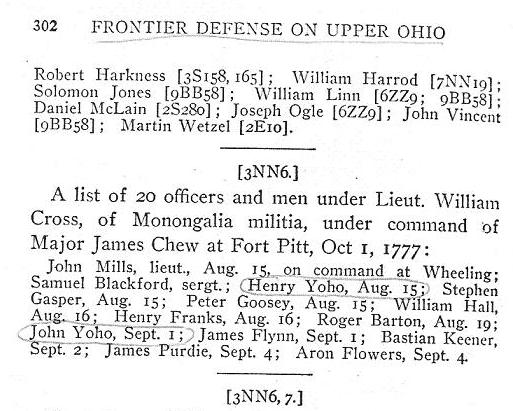 He made at least one spy trip with the famed Lewis Wetzel, a famous regional Indian fighter. They were in the army of General George Rogers Clark when he had such sucess in Illinois. Wetzel and Yoho were detailed at Point Pleasant to scout the Great Kanawha Valley and when they returned Clark had moved on so they missed Clark's Western Campaign. Henry Yoho tol his grandson, Samuel Goddard, that he was an associate of Lewis Wetzel, Simon Gurty, Adam Poe and other Indian fighters at their headquarters at Fort Wheeling.