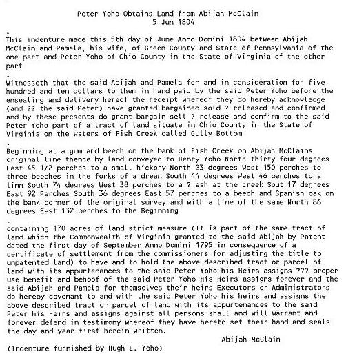 On June 5th 1804, Peter bought 170 acres of land at Gully Bottom, Fish Creek, near (Graysville, WV) from Abijah McClain for $502.00. The land adjoined land of his brother, Henry Yoho who bought 192 acres of Fish Creek from McClain on the same date for $525.00 (Deed Book 7, page 205).