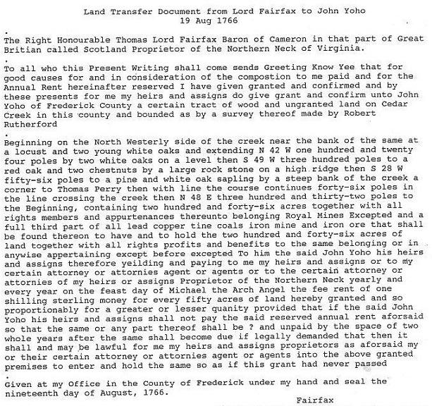 In 1771, John Yoho sold 246 acres of land near Winchester Va. to Alexander Machir.. This land was originally deeded to John Yoho from Lord Fairfax in 1766. Some have assumed that this John is Johannes Joho the original immigrant.. My hypothesis is that the John of this deed is the son of Johannes.