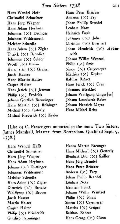 The first recorded evidence of Joho immigrants to the US was in 1738.. Pennsylvania German Pioneers (Genealogical Publishing Company 1966) recorded a list of all the Palatine Passenger on board the ship "Snow Two Sisters", James Marshall, Master, from Rotterdam, last from Cowes in England in the year 1738. The ship landed in Philadelphia on Sept 5th. The passenger list shows 41 men, 30 women and 39 children at half freight.. Among the passengers were Johannes Joho age 37 and his wife Susanna age 44*.. An "Oath of Allegance" list is also included. . Men were required to signify their allegance to the new country by putting an "X" by their name..