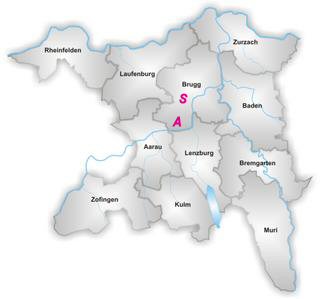 The Canton is divided into 11 districts (shown in Figure) each with its own capital. Auenstein (A) and Schinznach (S) are communities in the Brugg District.