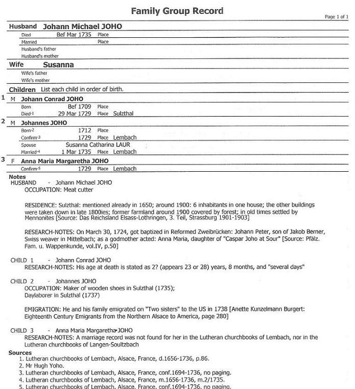 In early 2005, Hugh Yoho and I discussed hiring a European genealogist to do further research on the origin of Johannes (John) Michael Joho and his family. . Family traditions and investigations by Denver Yoho and others reported that Johannes Michael lived in Sulzthal near Lembach Alsace in the early 1700's but his place of birth was not known. . Johannes Michael married Susanna Gelker (location unknown) and they reportedly had four children in Alsace. One of those children, Johannes Joho emigrated to America and is the ancestor of most of the Yoho families living in the U.S.