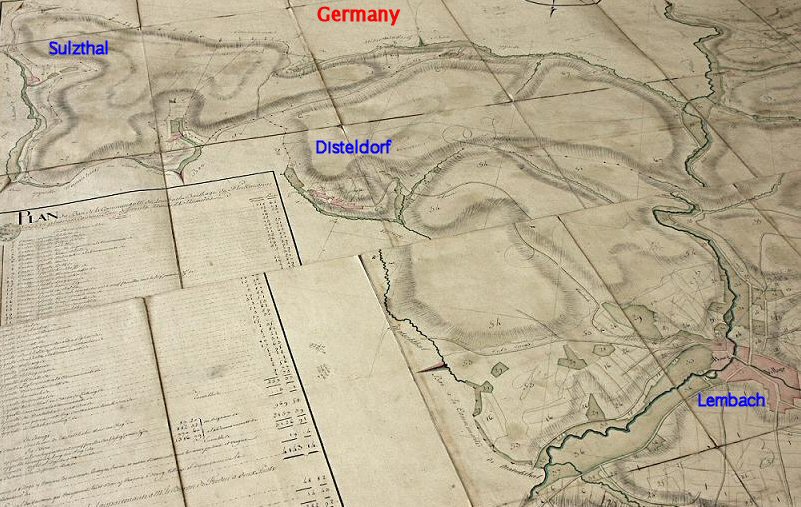 Johann Michael Joho was found in the Lutheran churchbooks of Lembach. He lived in Sulzthal, which was part of Lembach parish. I found out, that Sulzthal was not a village, but only a farm, situated close to Lembach. It was located west of Lembach, in a line Lembach - Disteldorf - Krautbrunnen - Sulzthal. In old maps I was able to identify the exact location. Sulzthal does not exist anymore, only the ground-course and a forester's house is left there. I took photos of the old map that you will find on the CD. Also attached is a detailed modern map that also shows the location