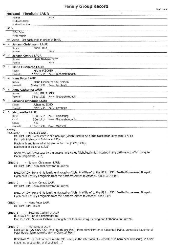 Theobald Laur (Lau) appears from 1714 in the records of lembach. He was a blacksmith and later became the farm administrator in Sulzthal.