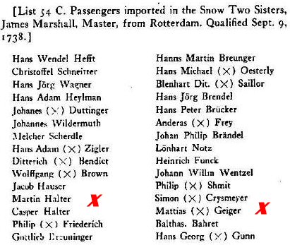 Joan Young contacted me in 2002 and indicated that Mattias Geiger and Hann Martin Halter were passengers on the Snow Two Sisters and were also from Lembach Alsace. It is very likely they were neighbors of the Joho's in Alsace.