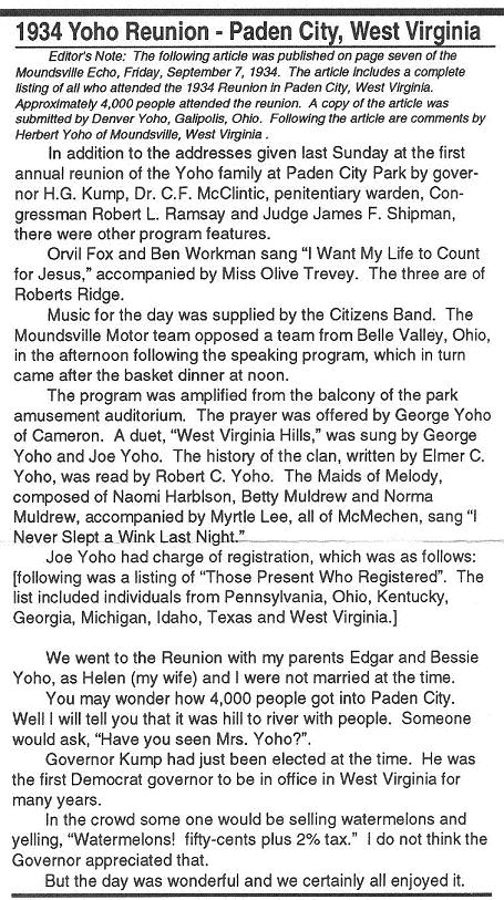 1992 Yoho Reunion (Includes Pic of Herb Yoho, Father of Web Page Editor Tim Yoho) |