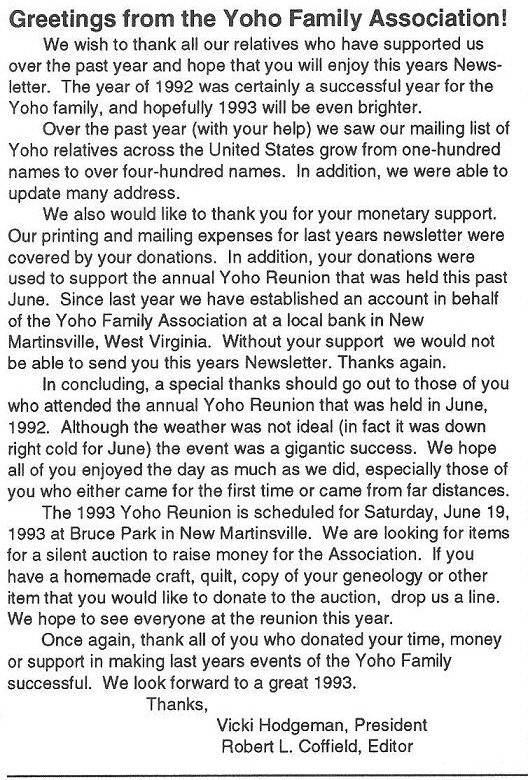 The Yoho Newsletter was a yearly publication of The Yoho Family Association. It was funded entirely from donations and was edited by Vicki Hodgeman of Moundsville, WV and Robert Coffield of Charleston, WV